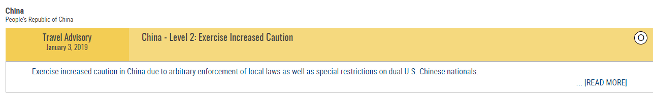 另据“商业内幕”报道,美国国务院发布的旅游警告共分为四级:一级为安全风险最低的“采取正常预防措施”;二级则敦促旅行者“加强防范”;三级为“重新考虑是否出行”;四级建议人们“不要出行”。除中国(大陆/内地)外,美国务院还对阿尔及利亚、南极洲、比利时、法国、德国、丹麦、缅甸和英国等地发布了二级旅行警告。