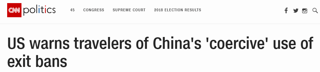 美国国务院在旅行警告中宣称,中国政府会利用“出境禁令”禁止美国公民离境,美国公民有时还会被滞留中国多年。警告还写道:美国公民“有可能在中国被拘留”。