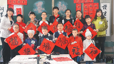 图为黑龙江省黑河市第二小学学生与来访的俄罗斯阿穆尔州布拉戈维申斯克市第26学校学生一起展示书法作品。 邱齐龙摄(人民图片)
