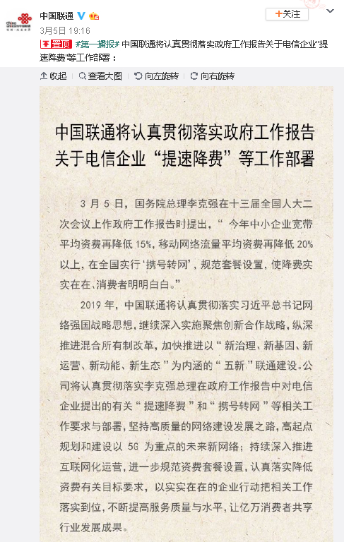 中国联通回应,将认真贯彻落实政府工作报告中对电信企业提出的有关“提速降费”和“携号转网”等相关工作要求与部署,坚持高质量网络建设发展之路,高起点规划和建设以5G为重点的未来新网络;持续深入推进互联网化运营,进一步规范资费套餐设置,认真落实降低资费有关目标要求。(央视记者 孙蓟潍)