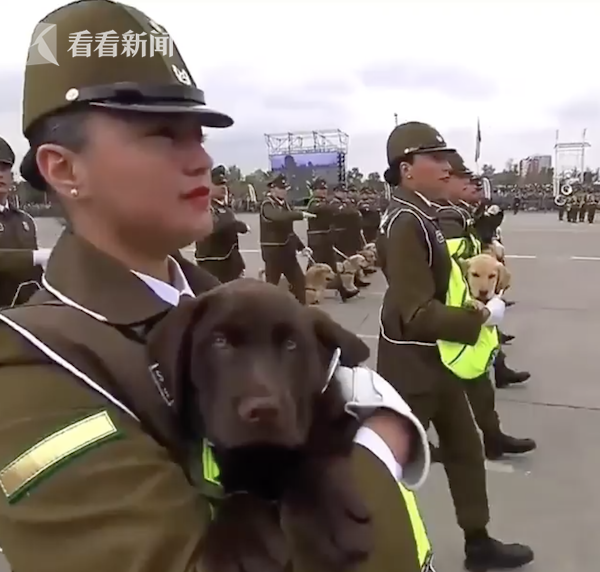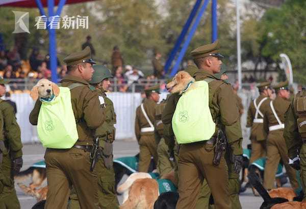 狗生第一场阅兵!智利超萌小警犬窝在包里"走"方阵