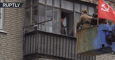 胜利日前夕,俄罗斯军乐团来到二战老兵窗前,为他们献上小型音乐会。