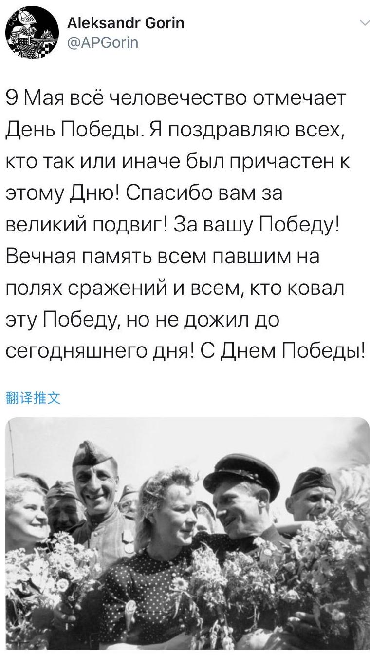 “5月9日,所有人都将庆祝胜利日这一伟大节日。我向所有人表示祝贺。感谢你们的丰功伟绩,感谢你们的胜利。感恩常在,记忆永存!胜利日快乐!”