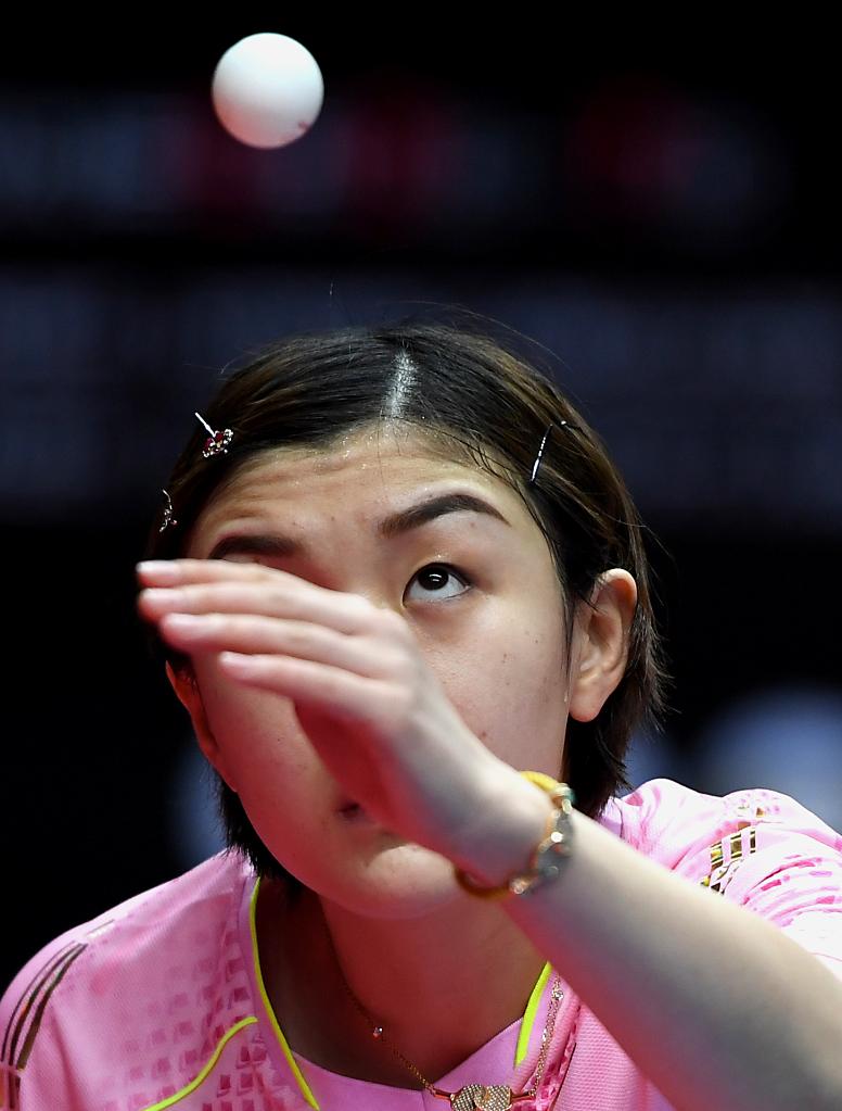5月6日,朱雨玲在比赛中回球。