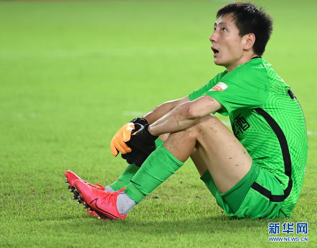 8月11日,青岛队守门员赵石在失球后坐在草地上。