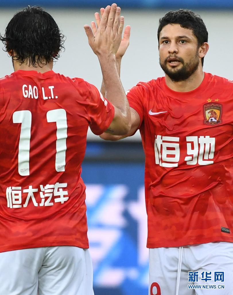 8月11日,广州队球员艾克森(右)进球后与队友高拉特击掌庆祝。