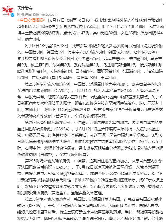 据天津发布微博消息,记者从市疾控中心获悉,8月17日18时至18日18时,天津市无新增本土新冠肺炎确诊病例,累计报告147例,其中男性82例,女性65例;治愈出院144例,病亡3例。