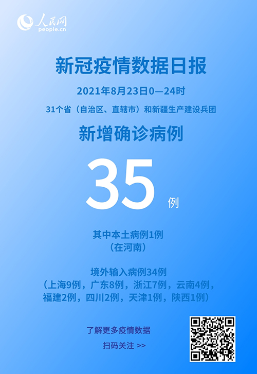 人民网北京8月24日电 (记者孙红丽)今日,国家卫生健康委于官网发布了截至8月23日24时新型冠状病毒肺炎疫情最新情况。8月23日0―24时,31个省(自治区、直辖市)和新疆生产建设兵团报告新增确诊病例35例,其中境外输入病例34例(上海9例,广东8例,浙江7例,云南4例,福建2例,四川2例,天津1例,陕西1例),本土病例1例(在河南);无新增死亡病例;新增疑似病例1例,为境外输入病例(在上海)。