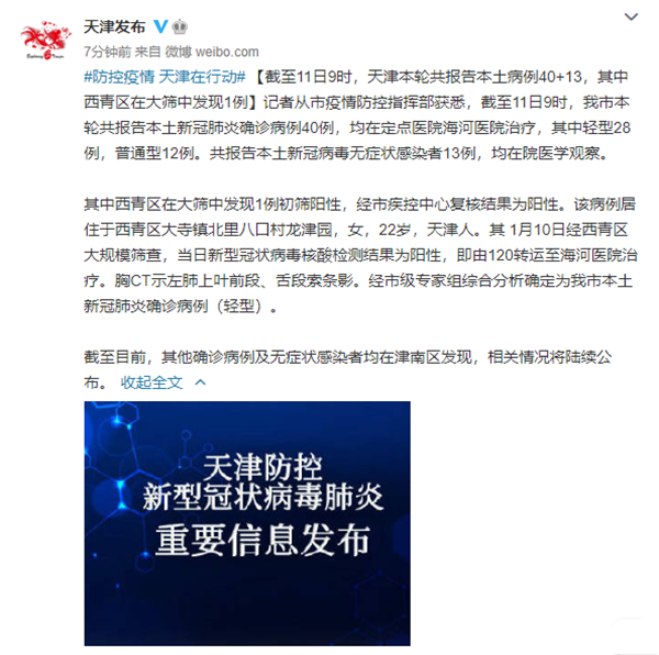 中国网1月11日讯 据天津市人民政府新闻办公室官方微博“天津发布”消息,截至11日9时,天津市本轮共报告本土新冠肺炎确诊病例40例,均在定点医院海河医院治疗,其中轻型28例,普通型12例。共报告本土新冠病毒无症状感染者13例,均在院医学观察。