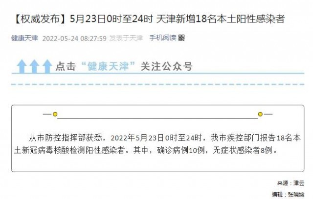 中新网5月24日电 据天津卫健委官方微信消息,从天津市防控指挥部获悉,2022年5月23日0时至24时,天津市疾控部门报告18名本土新冠病毒核酸检测阳性感染者。其中,确诊病例10例,无症状感染者8例。