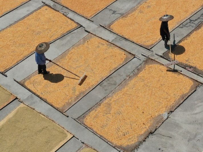 ↑9月2日,村民在贵州省黔东南苗族侗族自治州从江县刚边壮族乡三联村晾晒稻谷。新华社发(罗京来摄)