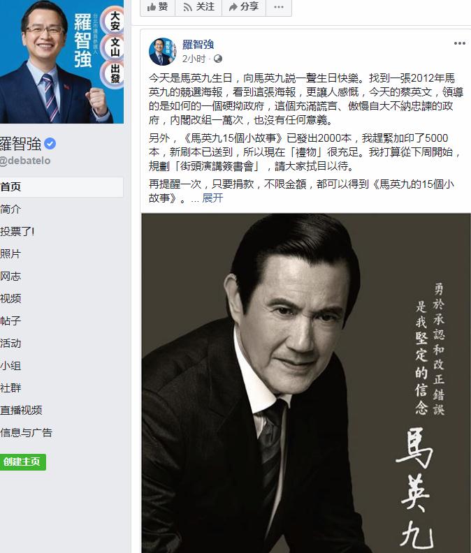 罗智强发文祝马英九生日快乐(Facebook截图)