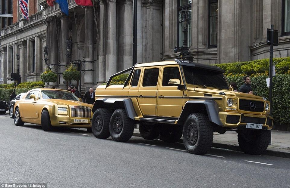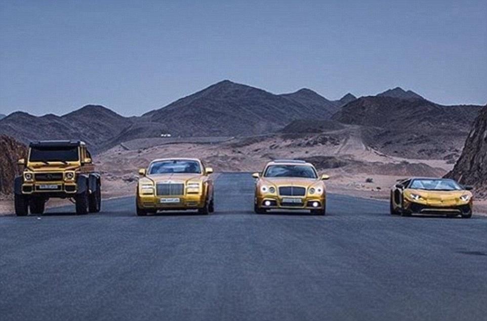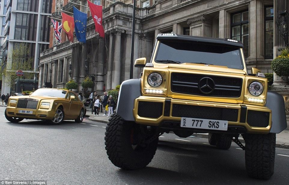 自从三月份到达伦敦开始度假,奢侈多金的阿布杜拉就迅速进入了人们的视线。他的镀金豪车阵容让人们惊呼不已:价值333万人民币的兰博基尼超级跑Aventador、价值352万的奔驰AMG越野、价值333万的劳斯莱斯幻影双门跑车、价值209万的宾利飞驰和价值171万兰博基尼跑车Huracan。所有的车外部都镀有黄金,从中东空运过来。