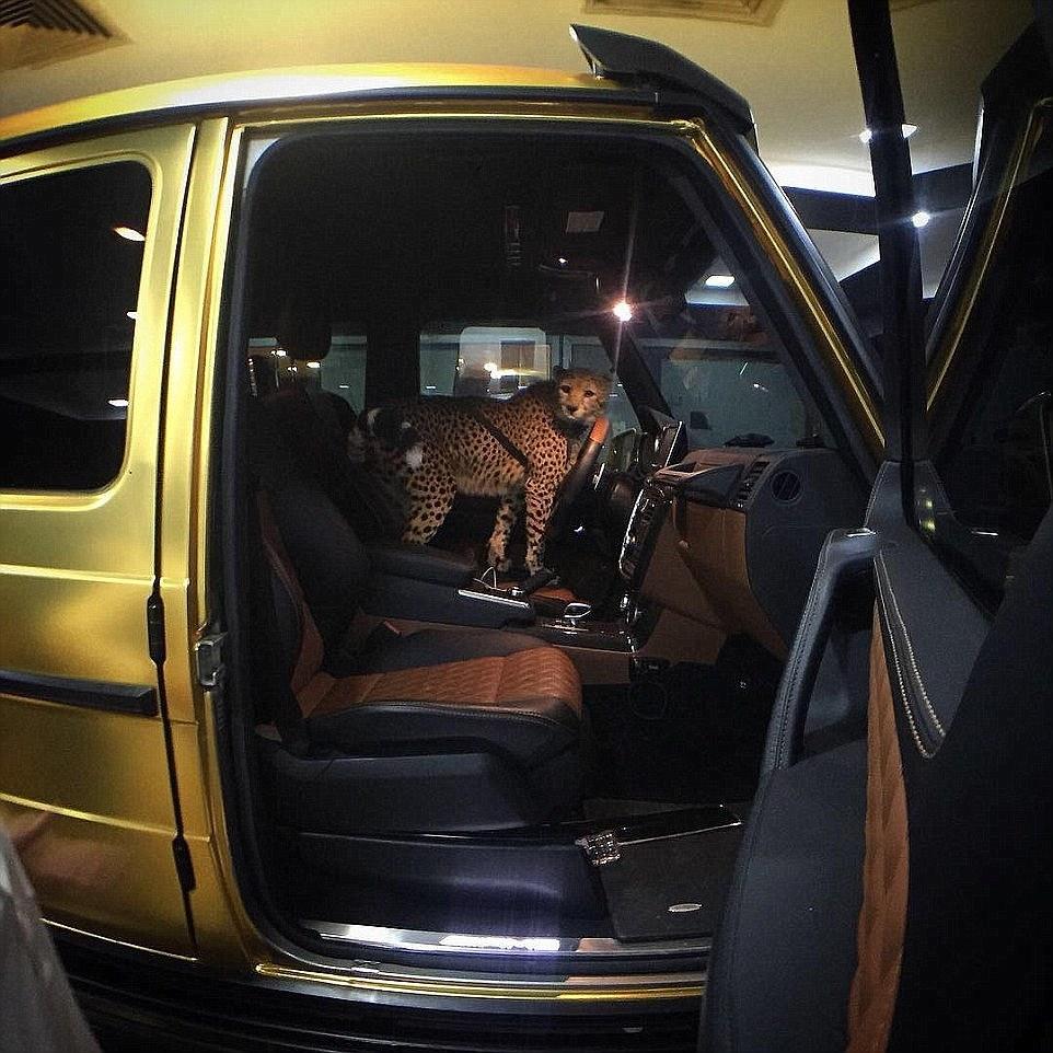图为阿布杜拉车上有一头猎豹被固定在汽车前座。阿布杜拉说自己从来没有违反过法律,他的公关人Michael说之前在伦敦街头的罚单对阿布杜拉而言是一个麻烦事,他认为媒体是想要通过这件事情来把他塑造成威胁伦敦的不负责任司机形象。“我在伦敦已经两个月了,如果我真的违反了法律的话,那英国政府估计不会允许我依旧在路上开车了吧。”