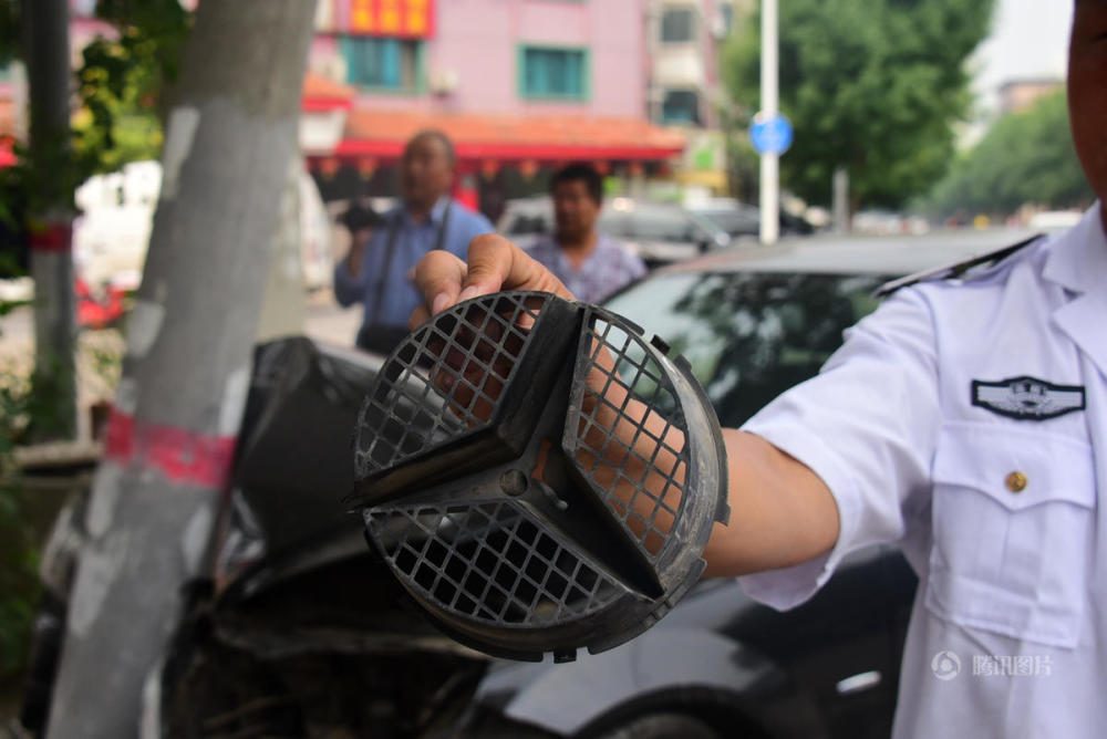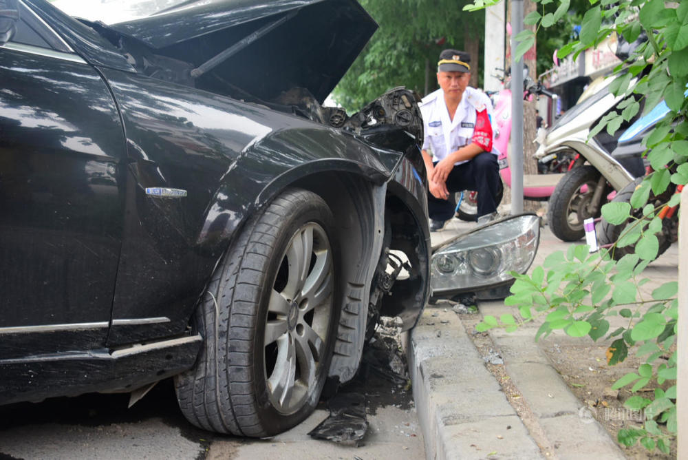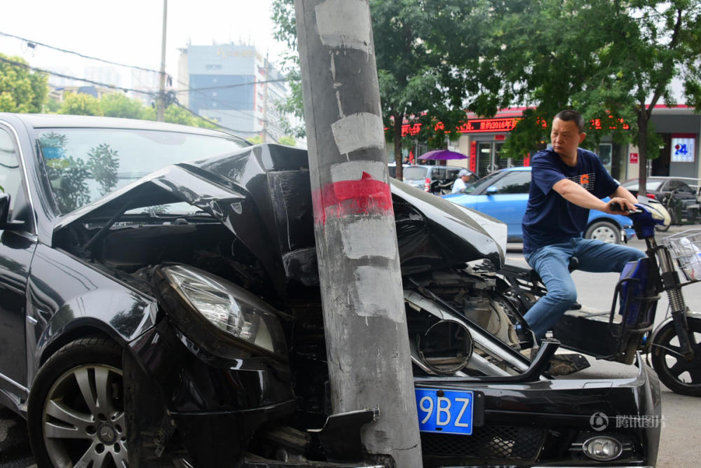 黑色奔驰轿车悬挂豫A号牌,该车车头左侧直接撞击线杆,引擎盖内已是一片狼藉,驾驶舱内的安全气囊也已弹起,遭其撞击的线杆发生断裂后摇摇欲倒。