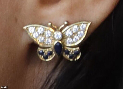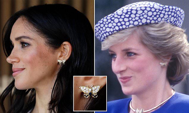 据英国《每日邮报》报道,梅根戴的正是哈利王子已故的母亲戴安娜王妃生前佩戴过的蝴蝶耳环和蓝色宝石手镯。