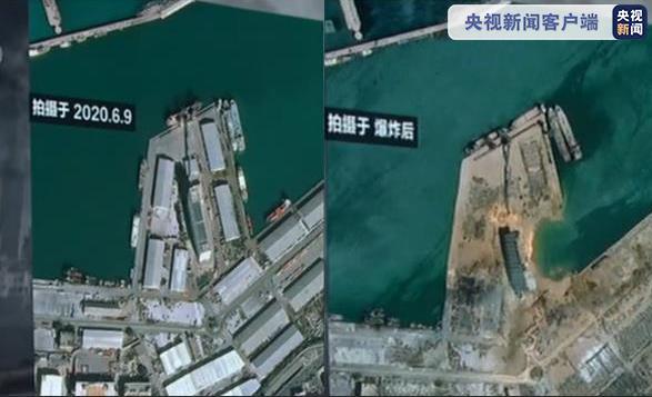 通过卫星图片可以看出,爆炸前,仓库等建筑散布在港口区。爆炸发生后,同一片区域的几乎所有建筑物都被夷为平地,港口区成为一片焦土。