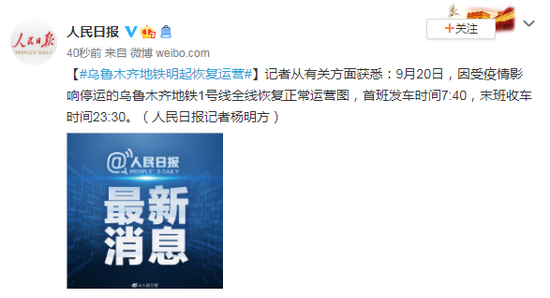 记者从有关方面获悉:9月20日,因受疫情影响停运的乌鲁木齐地铁1号线全线恢复正常运营图,首班发车时间7:40,末班收车时间23:30。(人民日报记者杨明方)