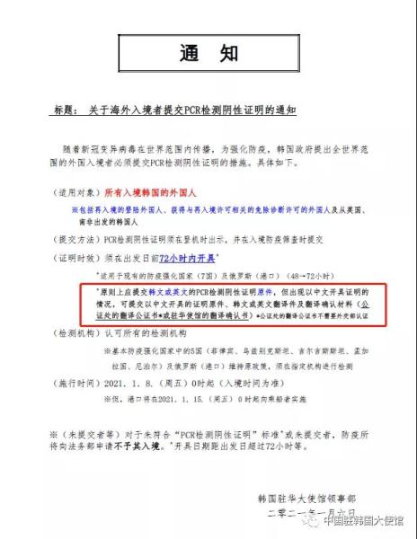中国侨网1月7日电 据中国驻韩国大使馆微信公众号消息,根据韩国政府要求,2021年1月8日0时起入境韩国的所有外国人需提供出发前72小时内的新冠病毒核酸检测(PCR)阴性证明。中国驻韩国大使馆已发布相关提醒。