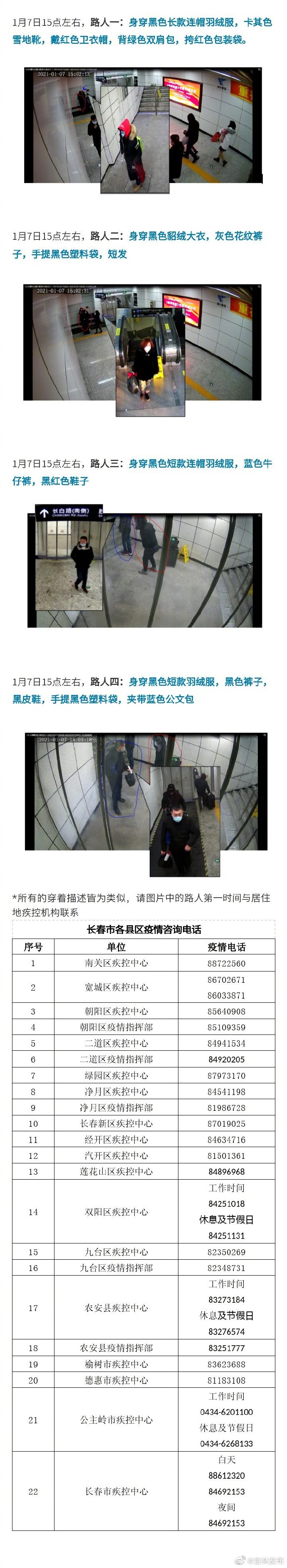 2021年1月12日,吉林省卫生健康委通报的无症状感染者3在1月7日曾到达长春站南广场地下东侧,分别在胜利大街、人民大街出站口与人交谈问路,以下人员存在感染风险。请图片中出现的路人与居住地疾控机构联系,留在家中避免外出。