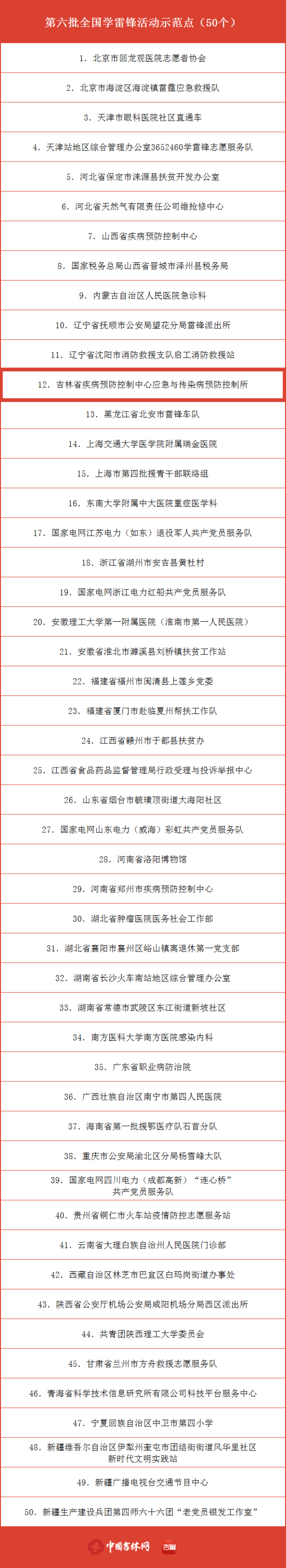 近日,中共中央宣传部命名第六批50个全国学雷锋活动示范点和50个全国岗位学雷锋标兵,吉林省疾病预防控制中心应急与传染病预防控制所被评为全国学雷锋活动示范点,吉林省人民医院主管护师张雅男、吉林省临江市六道沟镇向阳村教学点教师庄元军被评为全国岗位学雷锋标兵。目前,吉林省已累计有9个集体和12名个人获此殊荣。