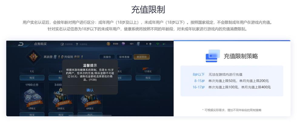 《通知》要求,网络游戏企业应限制未成年人使用与其民事行为能力不符的付费服务,未满8周岁的用户不得进行游戏付费;8周岁以上未满16周岁的用户,单次充值金额不得超过50元人民币,每月充值金额累计不得超过200元人民币;16周岁以上未满18周岁的用户,单次充值金额不得超过100元人民币,每月充值金额累计不得超过400元人民币。