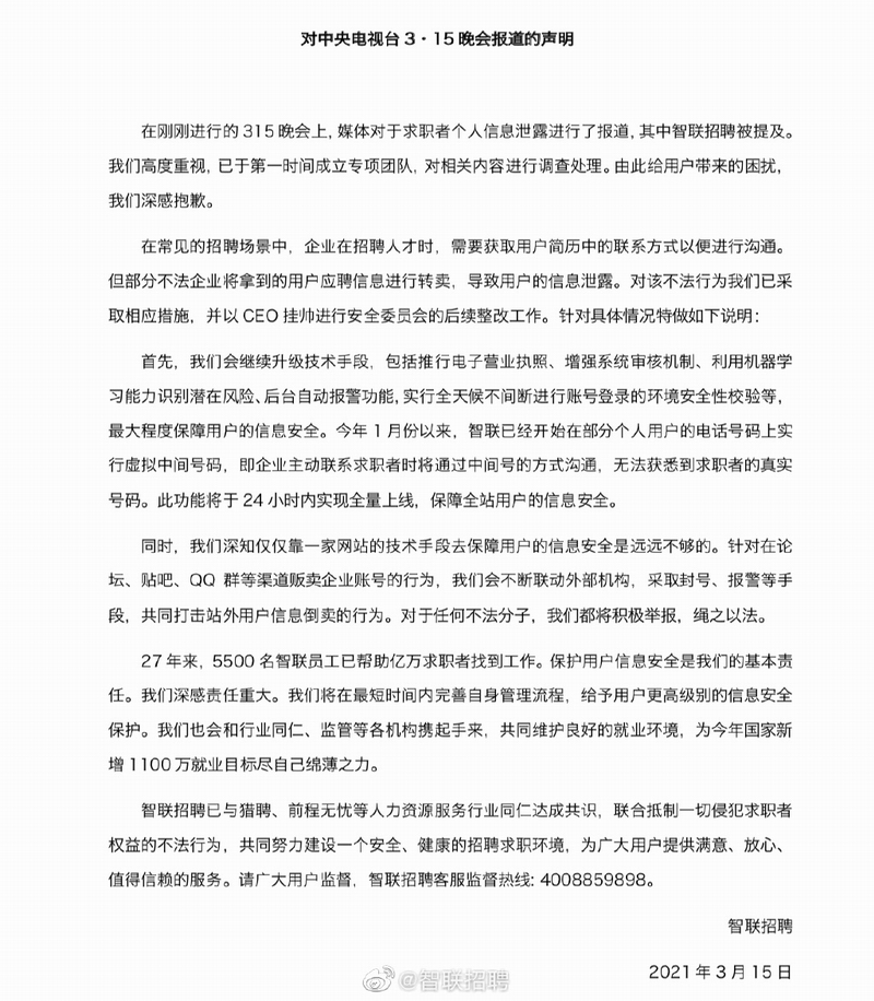 智联招聘官方微博今天凌晨发声明回应称,针对央视315晚会曝光的求职者个人信息泄露的情况,“已于第一时间成立专项团队,对相关内容进行调查处理。由此给用户带来的困扰,我们深感抱歉。”