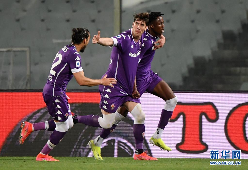 4月11日,佛罗伦萨队球员弗拉霍维奇(左)在打入本队第一粒进球后庆祝。