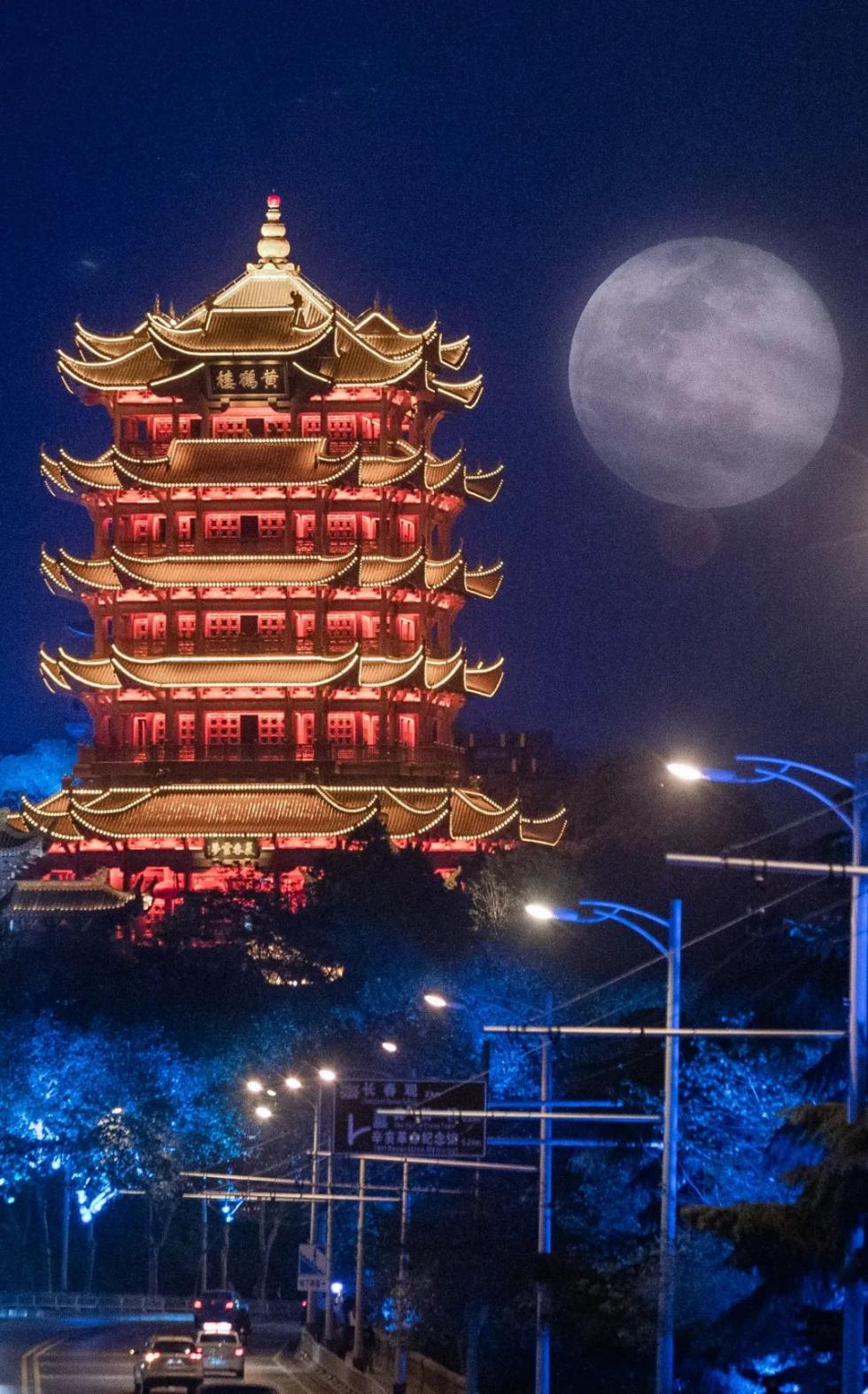 (2020年4月8日晚,武汉黄鹤楼下拍摄的超级月亮/摄影师@柯皓)