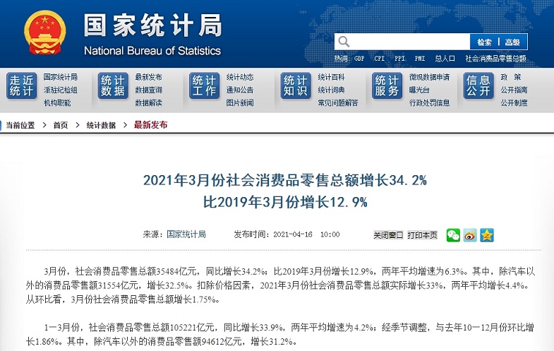 3月份,社会消费品零售总额35484亿元,同比增长34.2%;比2019年3月份增长12.9%,两年平均增速为6.3%。其中,除汽车以外的消费品零售额31554亿元,增长32.5%。扣除价格因素,2021年3月份社会消费品零售总额实际增长33%,两年平均增长4.4%。从环比看,3月份社会消费品零售总额增长1.75%。