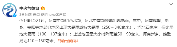 据中央气象台微博消息,今(21日)14时至21时,河南中部和西北部、河北中南部等地出现暴雨;其中,河南鹤壁、新乡、安阳等地部分地区出现大暴雨或特大暴雨(250~340毫米),河北石家庄、保定局地大暴雨(100~137毫米);上述地区最大小时降雨量50~90毫米,河南新乡、鹤壁局地110~150毫米。