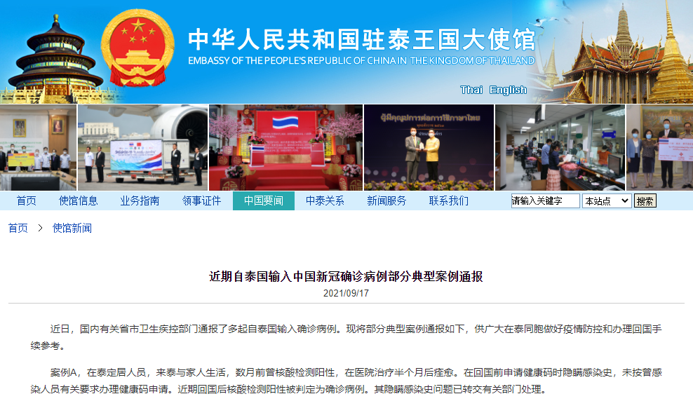 中使馆公布近期自泰国输入型新冠典型案例:自行服药后疑似症状消失,回国后确诊