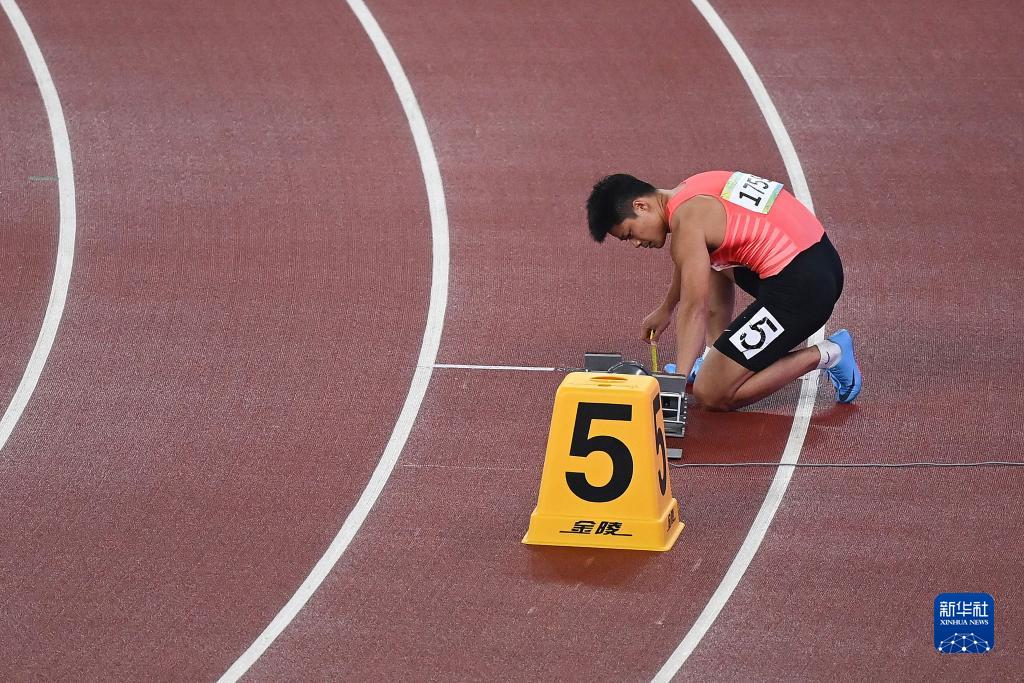 9月23日,广东队第一棒选手苏炳添在赛前测量起跑器。广东队获得亚军。