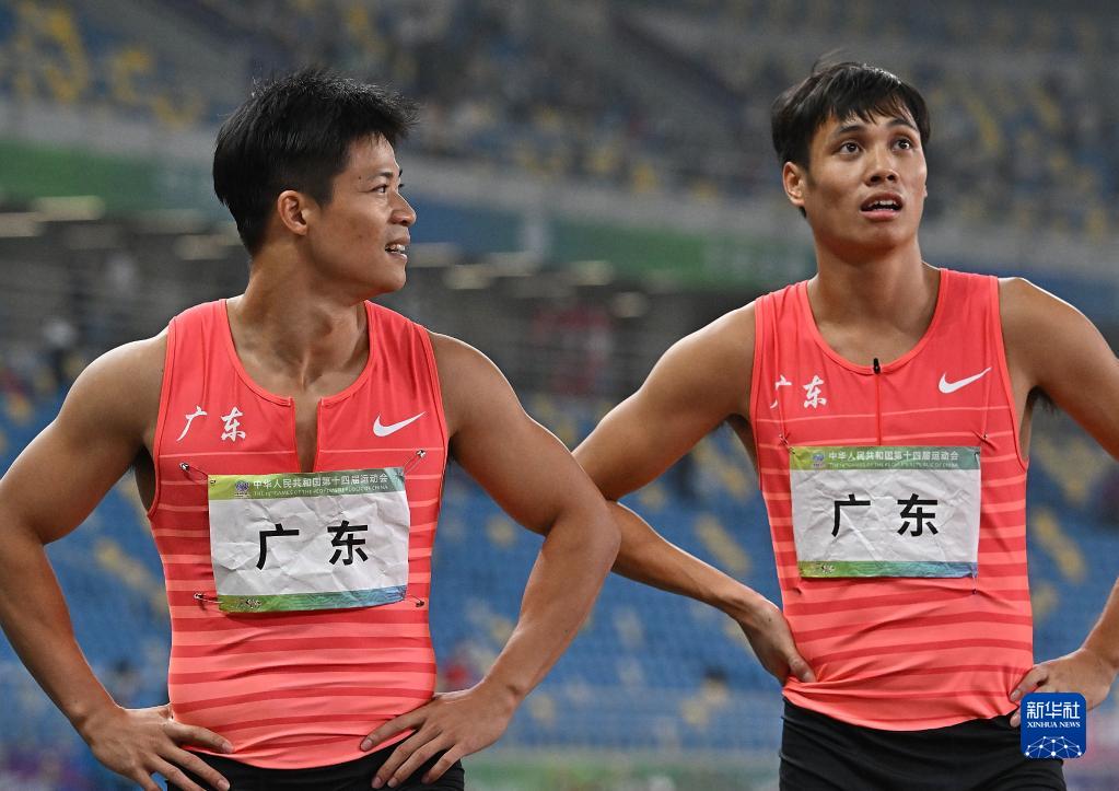 9月23日,广东队选手苏炳添(左)、莫有雪在比赛后。广东队获得亚军。