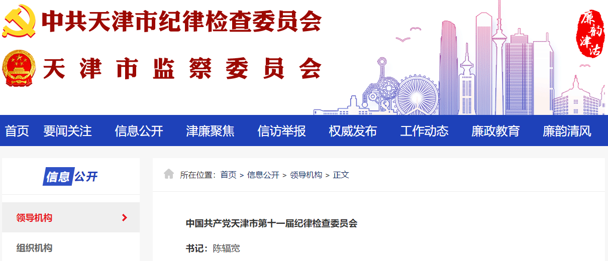 天津市纪委监委网站11月17日更新“领导机构”栏目信息显示,陈辐宽已经担任天津市纪委书记、监委主任候选人。(澎湃新闻记者 岳怀让)