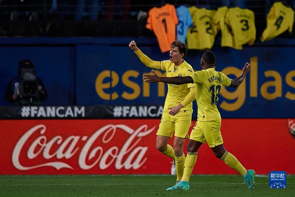 1月9日,比利亚雷亚尔球员保·托雷斯(左)在比赛中庆祝进球。