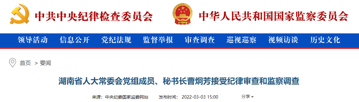 中央纪委国家监委网站讯 据湖南省纪委监委消息:湖南省人大常委会党组成员、秘书长曹炯芳涉嫌严重违纪违法,目前正接受湖南省纪委监委纪律审查和监察调查。