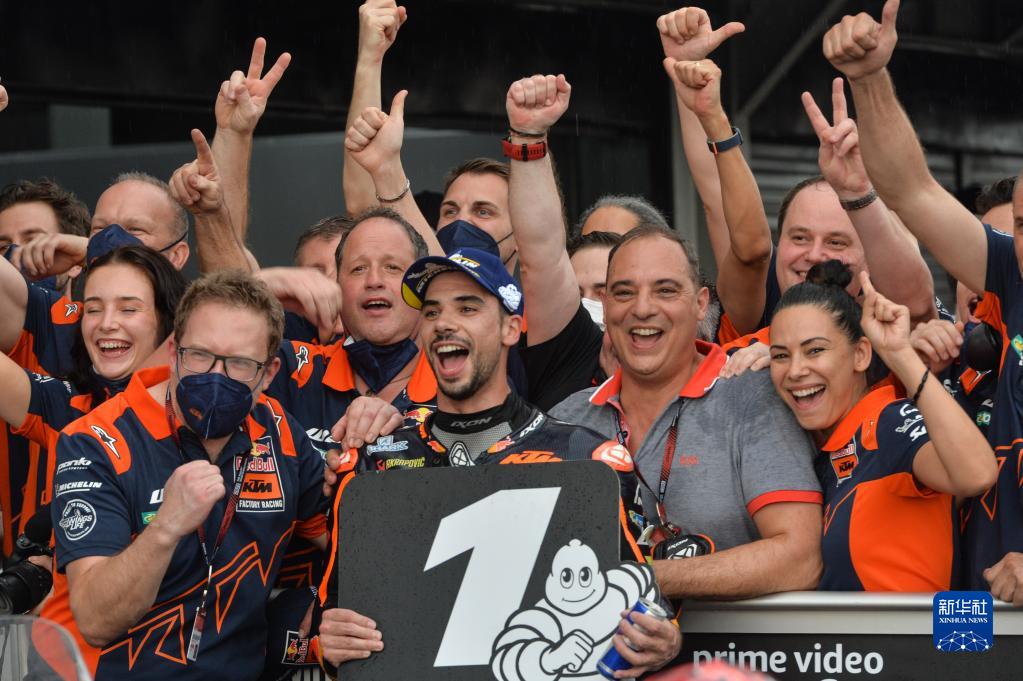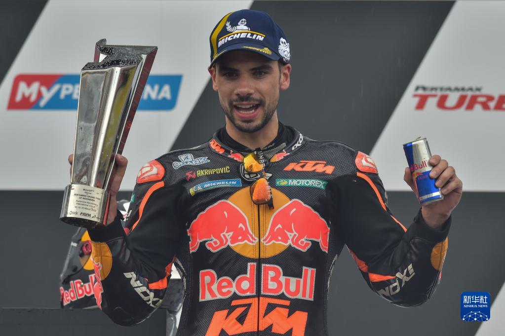 3月20日,冠军红牛KTM车队葡萄牙车手奥利韦拉在颁奖仪式上庆祝。