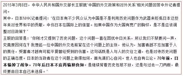在2015年王毅回答记者时说道:70年前,日本输掉了战争70年后日本不应再输掉良知