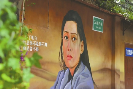 玉林上横巷附近的转角处,是电影《前任3》的结局拍摄地之一。林佳和孟云的过往,被一帧帧定格在了玉林四巷的墙壁上。绘制在墙面上的,还有《大话西游》里的“至尊宝”和“紫霞仙子”的爱情故事。一根笔直高耸的金箍棒立在地面上,敲出了一道道裂痕,“至尊宝”紧闭着双眼,愁眉紧锁。另一边,“紫霞仙子”双眼痴痴地看着远方。
