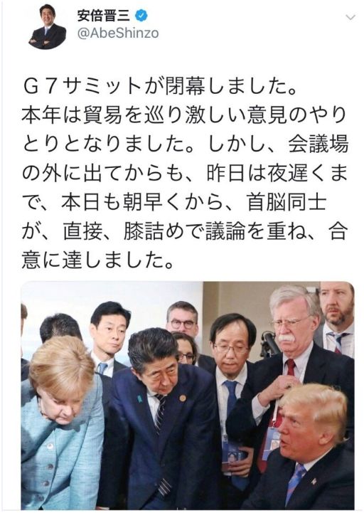 默克尔发布的G7峰会照片走红网络后,6月10日11时13分(日本时间),日本首相安倍晋三在推特上转发了首相官邸发布的一张G7照片。这张照片中,特朗普正在说着什么,而安倍注视着特朗普认真倾听,默克尔也在侧耳倾听。安倍发的照片与默克尔的相比,“内涵”大相径庭。