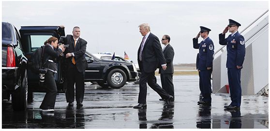白宫首席女摄影师克雷格海德(左一)为走下“空军1号”的特朗普拍照。