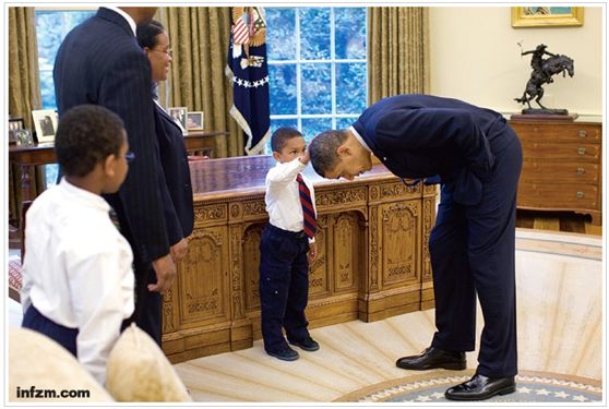 奥巴马弯腰让一名白宫职员的孩子摸头。