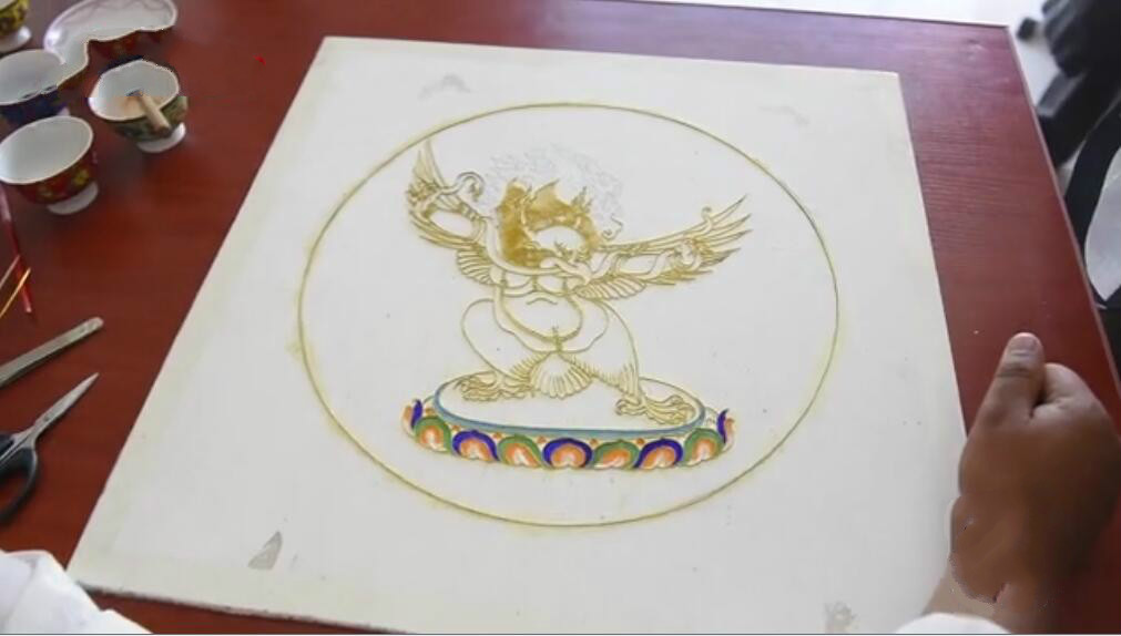 掐丝镶嵌珐琅唐卡又称金丝彩釉画。元朝时期由阿拉伯地区传入我国,工艺色彩艳丽,线条流畅,独具魅力,制作流程考究,主要通过选样、选釉、淘釉、筛釉、制样、掐丝、点蓝、制裱等几大程序,上千道重复手工工序来完成。其工艺特点吻合唐卡制作工艺要求,符合佛理,因此被运用于唐卡制作,通过金箔丝线勾画人物,佛像,展现佛光佛法,并通过艳丽的色彩展现人物的特性,使人物个性鲜明生动,充分体现出不同佛像的不同历史,宗教背景和寓意,使唐卡艺术得到了进一步的升华。