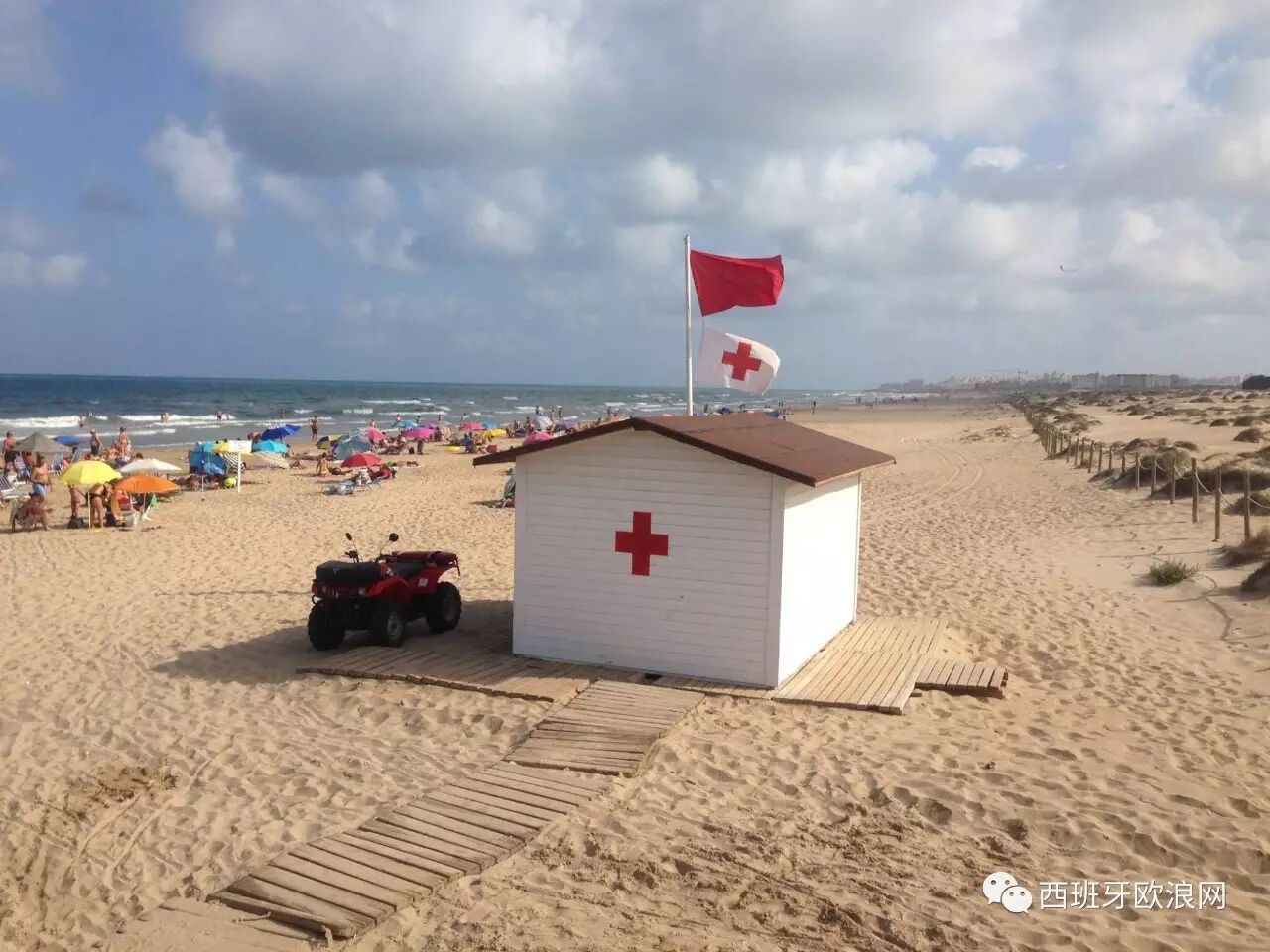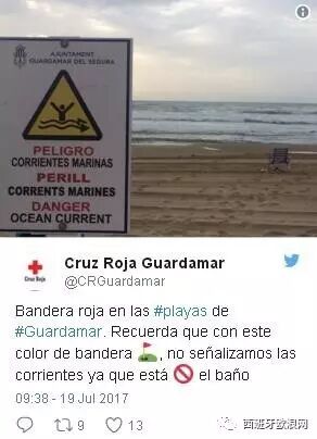 众所周知,西班牙的每个海滩都会以不同的颜色的旗帜作为标记以起到告知作用,例如“蓝旗海滩”意味着此处的沙滩的质量好,海水情况稳定,适合游泳。而“红旗海滩”则意味着海水情况不稳定,存在风险。