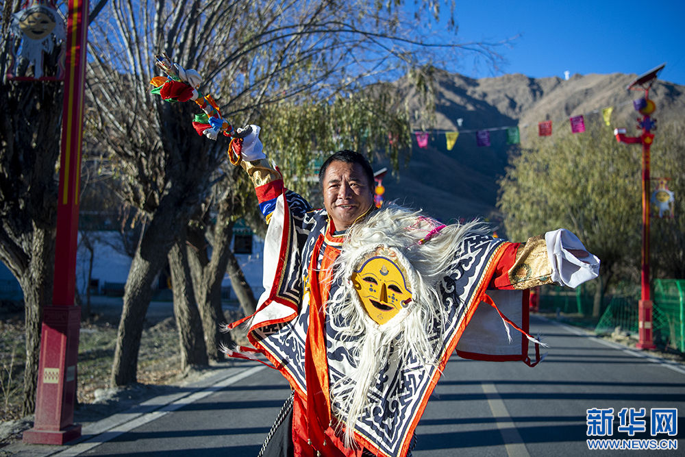 12月9日,雅砻扎西雪巴藏戏传承人尼玛次仁在表演藏戏。新华网 旦增努布 摄