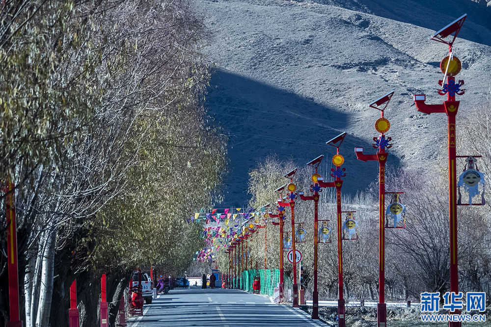 图为扎西曲登社区街边的藏戏主题路灯(12月9日摄)。新华网 旦增努布 摄