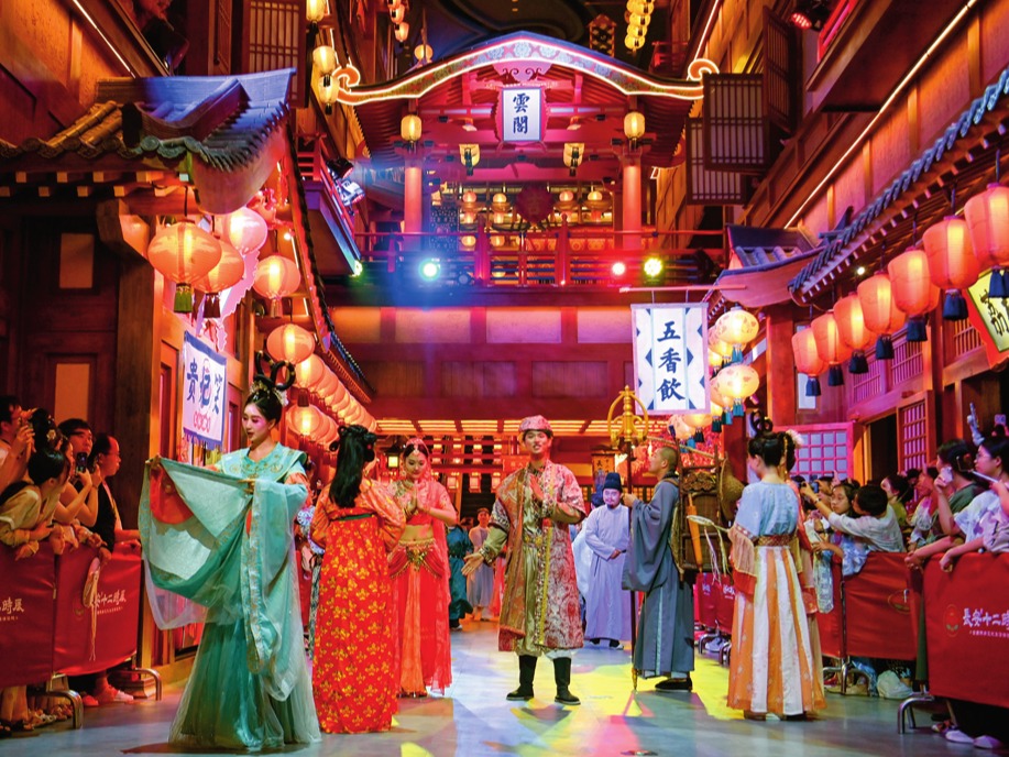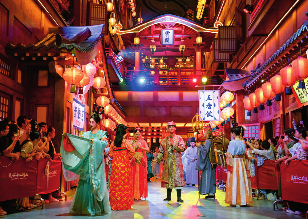 游客在西安长安十二时辰主题街区观看唐风演艺《万邦来朝》(2023年8月2日摄) 邹竞一摄/《瞭望》
