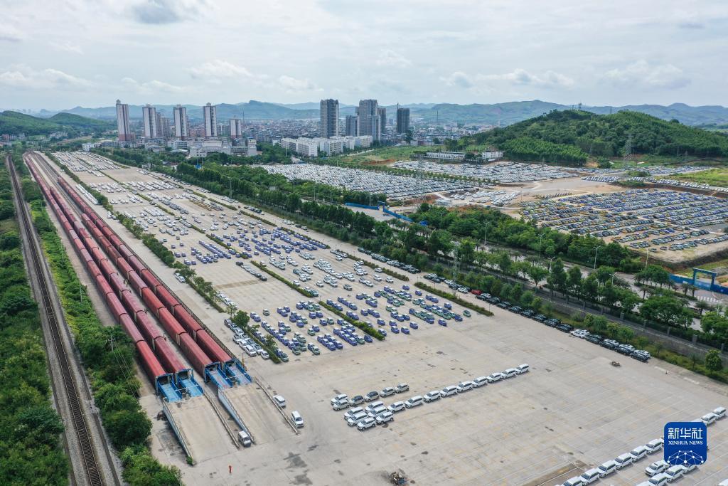 这是位于广西柳州市的雒容汽车物流基地,一些出口的新能源汽车从这里装车运往各大出海港口(7月19日摄,无人机照片)。新华社记者 曹祎铭 摄