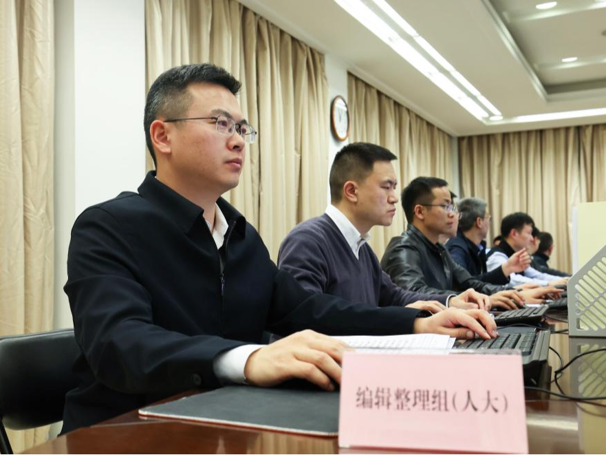 3月5日,工作人员对材料进行审核汇编。新华社记者 卢烨 摄